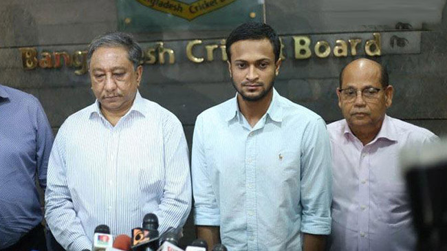 আইসিসি নিষেধাজ্ঞা ঘোষণার এক ঘণ্টা সময়ের মধ্যেই সাকিব আল হাসানকে নিয়েই মিডিয়ার সামনে হাজির হলেন বিসিবি সভাপতি নাজমুল হাসান পাপন। প্রথমে কথা বলেন সাকিব আল হাসান। এরপর কথা বলেন, বিসিবি সভাপতি নাজমুল হাসান পাপন। যদিও সাংবাদিকদের কোনো প্রশ্নের সুযোগ দেয়া হয়নি।
