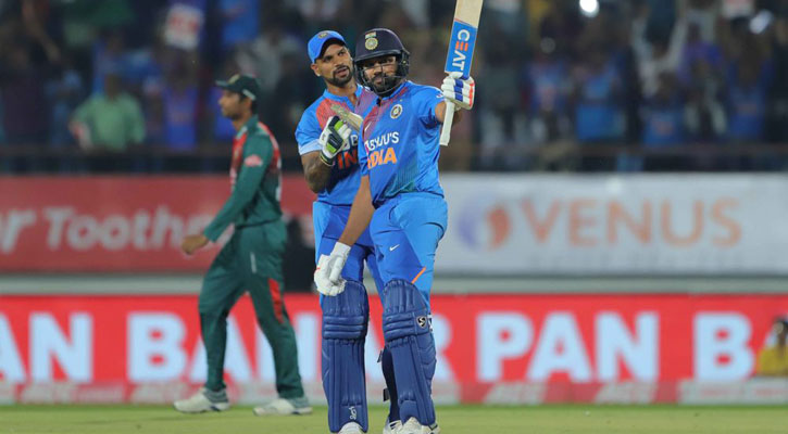 পাকিস্তানের শোয়েব মালিকের পর দ্বিতীয় ক্রিকেটার হিসেবে শততম টি-টোয়েন্টি ম্যাচ খেলতে নেমে ২৩ বলে ফিফটি স্পর্শ করেন রোহিত শর্মা। ১৩তম ওভারে আমিনুলের দ্বিতীয় শিকারে ফেরেন ভারতীয় এই দলপতি। তার আগে ৪৩ বলে ৬টি চার আর ৬টি ছক্কায় করেন ইনিংস সর্বোচ্চ ৮৫ রান। দলীয় ১২৫ রানের মাথায় দ্বিতীয় উইকেট হারায় ভারত। শ্রেয়াস আইয়ার ২৪ এবং লোকেশ রাহুল ৮ রানে অপরাজিত থাকেন।