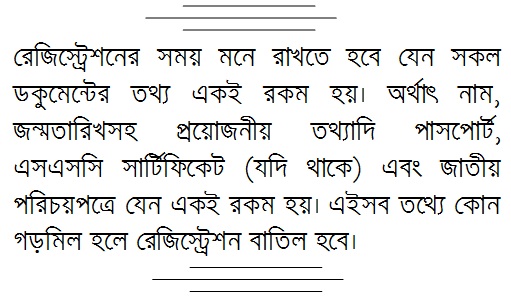 – অনলাইন রেজিস্ট্রেশনের সময় মেশিন রিডেবল পাসপোর্ট অনুযায়ী পুরো নাম, জন্মতারিখ, পাসপোর্ট নম্বর, পাসপোর্টের ২নং পৃষ্ঠার ছবিযুক্ত অংশের স্ক্যানকপি, পে অর্ডার স্ক্যানকপি ও মোবাইল নাম্বার ইনপুট করতে হবে।