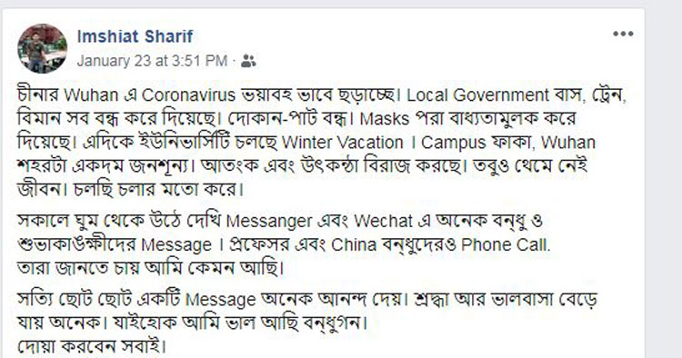 ইমশিয়াত শরিফ নামের পিএইডি করতে যাওয়া এক বাংলাদেশি তার ফেসবুক ওয়ালে লেখেন, ‘চীনের উহান শহরে করোনাভাইরাস ভয়াবহভাবে ছড়াচ্ছে। স্থানীয় সরকার বাস, ট্রেন, বিমান সব বন্ধ করে দিয়েছে। দোকানপাট বন্ধ। মাস্ক পরা বাধ্যতামূলক করে দিয়েছে। এদিকে ইউনিভার্সিটিতে চলছে শীতকালীন ছুটি। ফলে ক্যাস্পাস ফাঁকা, উহান শহরটা একদম জনশূন্য। আতঙ্ক এবং উৎকণ্ঠা বিরাজ করছে। তবুও থেমে নেই জীবন। চলছি চলার মতো করে।’