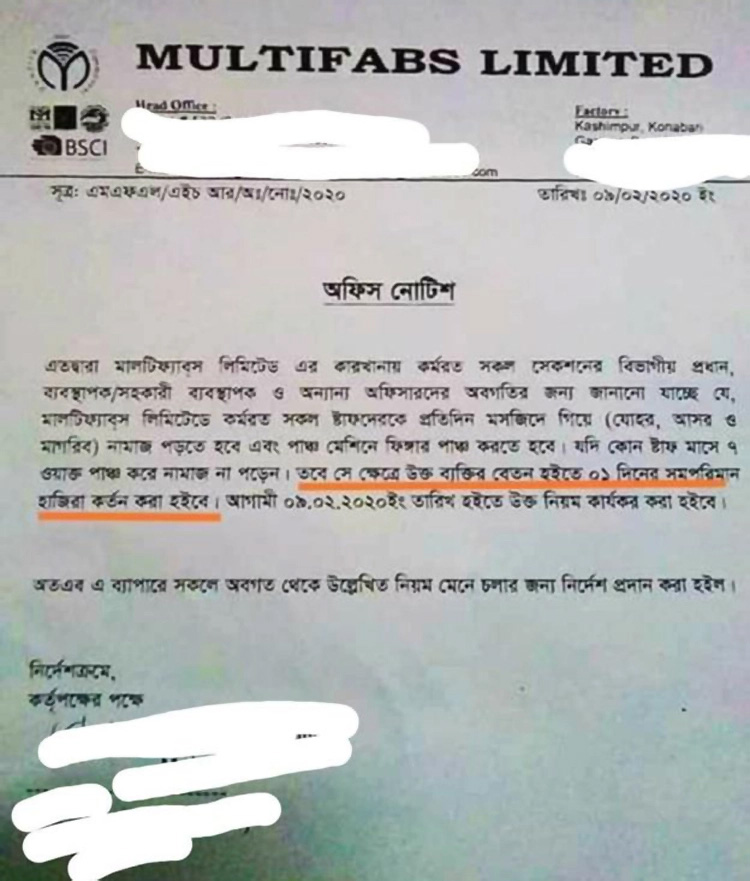 গাজীপুরে একটি পোশাক কারখানায় সব কর্মকর্তা, কর্মচারীর জন্য অফিস চলাকালীন প্রতিদিন মসজিদে গিয়ে যোহর, আসর ও মাগরিবের নামাজ পড়া বাধ্যতামূলক করা হয়েছে। ৯ ফেব্রুয়ারি জারি করা এক নোটিশে কারখানা কর্তৃপক্ষ বলেছে, এই তিন ওয়াক্ত নামাজ পড়তে যাওয়ার সময় পাঞ্চ মেশিনে পাঞ্চ করতে হবে। যদি কোনো স্টাফ মাসে সাত ওয়াক্ত পাঞ্চ করে নামাজ না পড়েন তবে সেক্ষেত্রে তার বেতন হতে একদিনের সমপরিমাণ হাজিরা কাটা হবে। মাল্টিফ্যাবস লিমিটেড নামের এই কারখানার অপারেশন্সবিষয়ক পরিচালক মেসবাহ ফারুকী জানিয়েছেন, এটি শুধু উচ্চ পদস্থ কর্মকর্তাদের জন্য। যদিও নোটিশে লেখা, ‘সকল স্টাফ’।