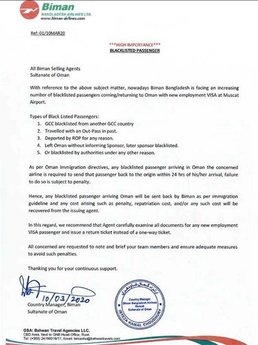 ৫. আরবাব/মালিক যদি কোনো কারণে আপনাকে কালো তালিকায় দেয়, তাহলে আপনি আর ওমানে প্রবেশ করতে পারবেন না।