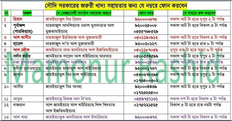 এসব সংগঠনের ফোন নম্বর উল্লেখ করে, নির্ধারিত সময়ে সাহায্যের জন্য কল করতে বলা হয়েছে। এছাড়াও এই সহায়তা কার্যক্রমে অংশ নিতে চাইলে নির্দিষ্ট ব্যাংক অ্যাকাউন্টে অর্থ জমা প্রদান করা যাবে মর্মে জানিয়েছে। অঞ্চলভিত্তিক টেলিফোন নম্বর ও সময়ের তালিকা প্রকাশ করা হয়েছে। যা নিচে উল্লেখ করা গেল।