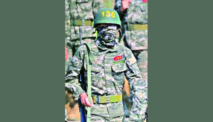 চেনা যায়! আপাদমস্তক সামরিক পোশাকে ঢাকা মানুষটি সন হিউন মিন। ২৭ বছর বয়সী এই টটেনহাম ফরোয়ার্ড এখন নিজ দেশ দক্ষিণ কোরিয়ায় সেনাবাহিনীর বুট ক্যাম্পে আছেন। এই ছবিটি জেজু আইল্যান্ডে মেরিন সৈন্যদের ফায়ারিং রেঞ্জে রাইফেল অনুশীলন থেকে ক্যাম্পে ফেরার সময় তোলা। গত মাসে শুরু হওয়া বাধ্যতামূলক সামরিক প্রশিক্ষণটিতে মোট তিন সপ্তাহ থাকবেন তিনি।