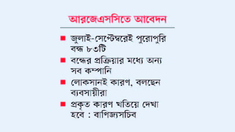 অর্থনৈতিক সংকটসহ বিভিন্ন কারণে গত দুই মাসে সিটি গ্রুপ, বিএসআরএম, ইউএস-বাংলাসহ দেশি-বিদেশি বিভিন্ন গ্রুপের দেড় শতাধিক কম্পানি তাদের ব্যবসা গুটিয়ে নেয়ার সিদ্ধান্ত নিয়েছে। এরই মধ্যে জুলাই-সেপ্টেম্বরে ৮৩টি কোম্পানি পুরোপুরি বন্ধ হয়ে গেছে। বন্ধের যে ধারা, তাতে বিশ্লেষকরা একে কিছুটা অস্বাভাবিক বলছেন।