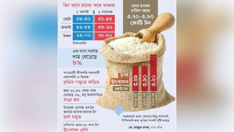 কৃষি সম্প্রসারণ অধিদপ্তরের তথ্য বলছে, দেশে চালের বার্ষিক চাহিদা ৩ কোটি ৭০ লাখ থেকে ৩ কোটি ৯০ লাখ টন। ২০২১-২২ অর্থবছরে ৩ কোটি ৮৯ লাখ ৩৬ হাজার টন এবং ২০২২-২৩ অর্থবছরে ৩ কোটি ৯০ লাখ ৩৫ হাজার টন চাল উৎপাদন হয়েছে। তবে সর্বশেষ ২০২৩-২৪ অর্থবছরে উৎপাদন হয়েছে ৪ কোটি ২০ লাখ টন। সে হিসাবে চাহিদার চেয়ে উৎপাদন বেশি হয়েছে ৩০ লাখ টনের মতো। এতে চাল উদ্বৃত্ত থাকার কথা। এদিকে কৃষি মন্ত্রণালয়ের তথ্য বলছে, সাম্প্রতিক বন্যায় ৮ লাখ ৩৯ হাজার টন চালের উৎপাদন ব্যাহত হয়েছে। মিলারার বন্যার উছিলা আর মজুত ফুরিয়ে আসছে বলে ধুয়া তুলে ভোক্তার পকেট কাটছে।