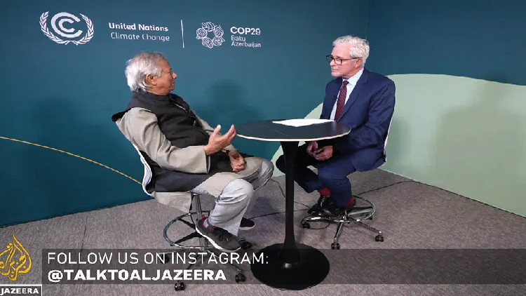 সম্প্রতি আজারবাইজানের রাজধানী বাকুতে অনুষ্ঠিত জাতিসংঘের জলবায়ু সম্মেলনের (কপ২৯) ফাঁকে আল–জাজিরাকে এই সাক্ষাৎকার দেন ড. মুহাম্মদ ইউনূস। গতকাল রোববার এই ভিডিও সাক্ষাৎকার সম্প্রচার করেছে আল–জাজিরা। সাক্ষাৎকারে জলবায়ু পরিবর্তনের প্রভাবে বাংলাদেশ যেসব সংকট মোকাবিলা করছে, সেগুলো নিয়ে কথা বলার পাশাপাশি বাংলাদেশে চলমান সংস্কারপ্রক্রিয়া, আগামী নির্বাচন, পরিবর্তিত পরিস্থিতিতে কূটনৈতিক সম্পর্ক এবং যুক্তরাষ্ট্রের নবনির্বাচিত প্রেসিডেন্ট ডোনাল্ড ট্রাম্পের সঙ্গে সম্পর্ক নিয়ে কথা বলেছেন তিনি।