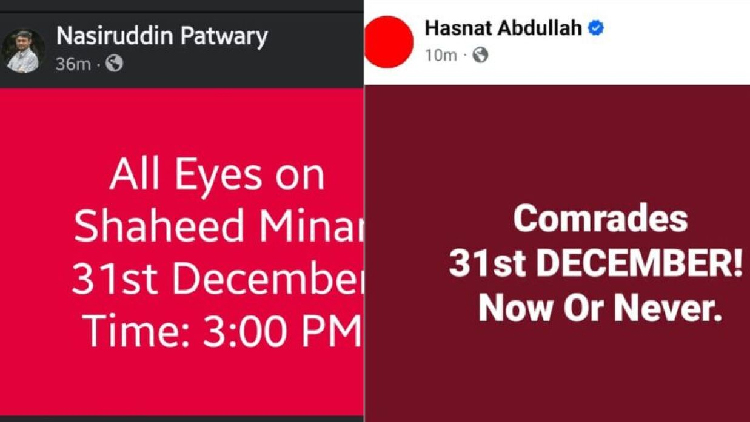 বৈষম্যবিরোধী ছাত্র আন্দোলনের আহ্বায়ক হাসনাত আব্দুল্লাহ লিখেছেন, `কমরেডস, ৩১ ডিসেম্বর! নাও অর নেভার’। বৈষম্যবিরোধী ছাত্র আন্দোলনের অন্যতম সমন্বয়ক রিফাত রশিদ তার ফেসবুক পোস্টে লিখেছেন, অল আইজ অন ৩১ ডিসেম্বর, ২০২৪. নাও অর নেভার!’