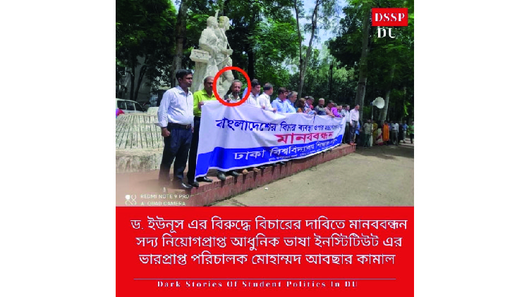 পতিত আওয়ামি লীগ সরকারের সময়ে যখন ড. ইউনুসকে হয়রানি করা হচ্ছিলো। তখন ড. ইউনুসেরই বিরুদ্ধে ঢাকা বিশ্ববিদ্যালয়ের অপরাজেয় বাংলায় ৪ সেপ্টেম্বর ২০২৩ সালে একটি মানববন্ধন করে ঢাকা বিশ্ববিদ্যালয়ের নীল দল। সেই মানববন্ধনে অংশ নেন আধুনিক ভাষা ইন্সটিটিউটের বর্তমান ভারপ্রাপ্ত পরিচালক আবছার কামাল। সেই মানববন্ধনে তিনি তার বক্তব্যে ড. ইউনুসের বিরুদ্ধে মিথ্যাচার করে এবং ড. ইউনুসের শাস্তিও দাবী করেন।