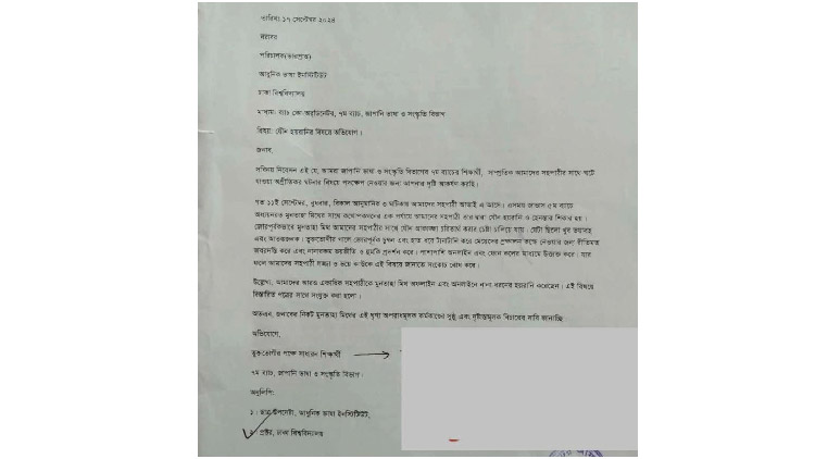 আধুনিক ভাষা ইনস্টিটিউটের একজন ছাত্রের বিরুদ্ধে ২০২৪ সালের ১৭ সেপ্টেম্বর লিখিত অভিযোগ দেয় তার সহপাঠীরা। অভিযুক্ত ছাত্র ক্লাস রুমে যৌন হয়রানি করার সুস্পষ্ট প্রমাণ আছে বলে জানায় সেই বিভাগের ছাত্রছাত্রীরা। তদন্ত কমিটি গঠন করে ৩ দিনের মধ্যে সেই অভিযোগ নিষ্পত্তির কথা থাকলেও এখনো তদন্ত আলোর মুখ দেখেনি। অভিযুক্ত ছাত্র পতিত সরকারের ছাত্র সংগঠন ছাত্রলীগের পদধারী সদস্য এবং ভারপ্রাপ্ত পরিচালককে বিভিন্ন অনিয়মের সহযোগিতা করায় অন্যতম ভূমিকা পালন করছে বলে অভিযোগ রয়েছে।