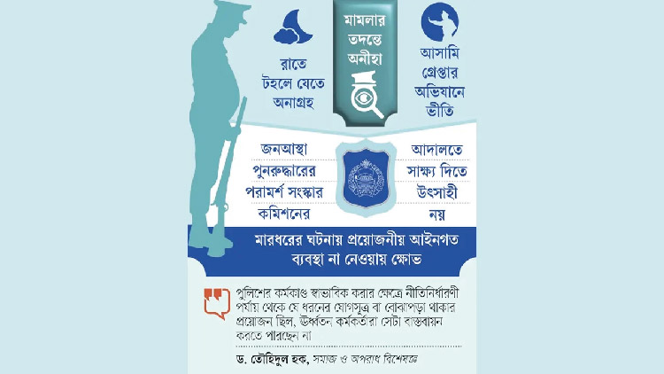 এভাবে রাজধানী ও রাজধানীর বাইরে বেশকিছু থানার ওসি, এসআইসহ মাঠ পর্যায়ের কর্মকর্তাদের সঙ্গে আলাপ করে জানা গেছে, ‘পুলিশ এখনো নিজেরাই নিরাপত্তাহীনতায় ভুগছে। ফলে তারা টহল ও তল্লাশিতে যেতে অনীহা প্রকাশ করছে। মামলার তদন্ত ও আসামি গ্রেপ্তার অভিযানে যাওয়ার ঝুঁকি নিতে চাচ্ছে না তারা। আবার অনীহা আদালতে সাক্ষ্য দিতে। অনেকে নানা অজুহাতে আদালতে সাক্ষ্য দিতে যাচ্ছেন না। বিশেষ করে যারা গত ১৫ বছরে বিভিন্ন থানায় কর্মরত ছিলেন, তারা ওই এলাকায় সাক্ষ্য দিতে যেতে ভয় পাচ্ছেন। এতে করে স্থবিরতা দেখা দিয়েছে রুটিন পুলিশিংয়েও। যার সুযোগ নিচ্ছে নানা শ্রেণির অপরাধী চক্র।’