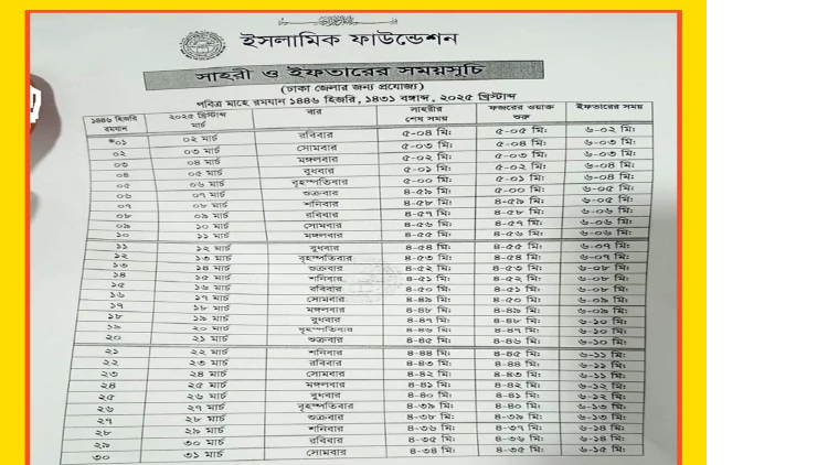 গত ২৭ জানুয়ারি ইসলামিক ফাউন্ডেশন ১৪৪৫ হিজরির রমজান মাসের সাহরী ও ইফতারের এ সময়সূচি চূড়ান্ত করে।