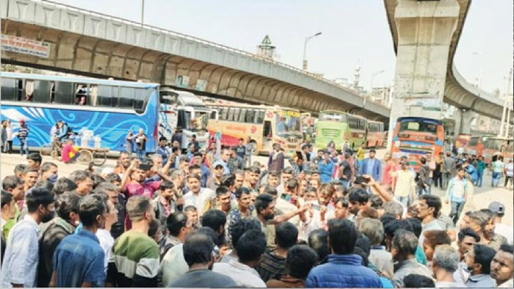 যেখানে-সেখানে যাত্রী তোলার দাবিতে বাসশ্রমিকদের সড়ক অবরোধ