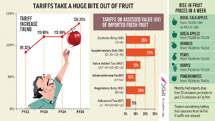 ফলে পুষ্টি যতই প্রয়োজনীয় হোক না কেন, ফল খাওয়া এখন সাধারণ ভোক্তার জন্য বিলাসিতা হয়ে উঠেছে। কারণ সরকার বছরের পর বছর ধরে আমদানি করা তাজা ফলের ওপর শুল্ক বাড়িয়ে চলেছে। এতে একদিকে ফলের দাম বাড়ছে, অন্যদিকে আমদানি ক্রমাগত কমছে।