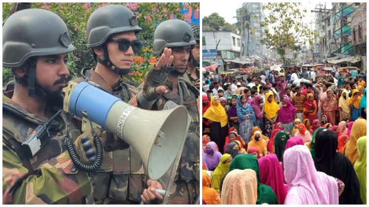হ্যান্ড মাইকে এক সেনা কর্মকর্তা ঘোষণা করেন, আপনাদের দাবি-দাওয়া নিয়ে নেগোসিয়েশন চলছে, চলবে। এটা নিয়ে কোনো সমস্যা নেই। ফ্যাক্টরির ভেতরে মালিক ও শ্রমিকের কোনো অমিল থাকলে সেটা নেগোসিয়েশনের মাধ্যমে সমাধান হবে। কিন্তু গতকালও শ্রম মন্ত্রণালয় থেকে বলা হয়েছে, রেসপেক্টেড আইজিপিও সংবাদ সম্মেলনে ডিরেক্ট বলে দিয়েছেন, কোনো রকম রোড ব্লক এখন থেকে গ্রাহ্য করা হবে না। রোডব্লক-জনভোগান্তি এক পানিশেবল ক্রাইম। এর জন্য আপনার যে কেউ সাজাপ্রাপ্ত হতে পারেন।