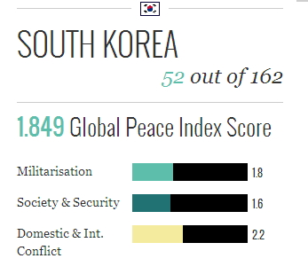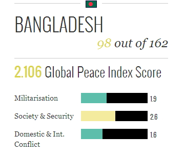 ২০১৪ সালের ‘বৈশ্বিক শান্তি সূচক’-এ ১৬২টি দেশের মধ্যে বাংলাদেশের অবস্থান সাত ধাপ এগিয়ে হয়েছে ৯৮ আর পাঁচ ধাপ পিছিয়ে দক্ষিণ কোরিয়া রয়েছে ৫২তম স্থানে। সূচকে টানা সপ্তমবারের মতো বিশ্বের সবচেয়ে শান্তিপূর্ণ দেশ বিবেচিত হয়েছে আইসল্যান্ড। টানা চতুর্থ বছরের মতো দ্বিতীয় অবস্থানটি ধরে রেখেছে ডেনমার্ক। এক ধাপ এগিয়ে সূচকে তিন নম্বরে উঠে এসেছে অস্ট্রিয়া। অস্ট্রেলিয়ার সিডনীভিত্তিক আন্তর্জাতিক গবেষণা সংস্থা ইনস্টিটিউট ফর ইকনোমিকস অ্যান্ড পিস (আইইপি) ২০০৭ সাল থেকে প্রতি বছর এই সূচক প্রণয়ন করে আসছে।
