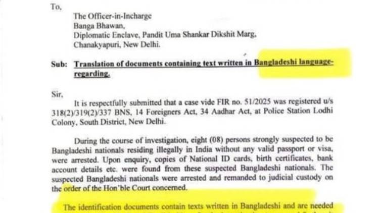 দিল্লি পুলিশের ওই চিঠিতে বলা হয়, সন্দেহভাজন আটজন ‘বাংলাদেশি অনুপ্রবেশকারী’ সম্পর্কে কিছু নথি বাংলায় লেখা হওয়ায় তা অনুবাদে সাহায্যের জন্য দিল্লির বঙ্গভবনের কাছে আবেদন জানানো হয়। এই চিঠির একটি ছবি সামাজিক মাধ্যমে শেয়ার করে মুখ্যমন্ত্রী মমতা বন্দ্যোপাধ্যায় লিখেছেন, “বাংলা ভারতের সংবিধান স্বীকৃত ভাষা। রবীন্দ্রনাথ ঠাকুর ও বঙ্কিমচন্দ্র চট্টোপাধ্যায়ের মাতৃভাষা বাংলা, তাকে বাংলাদেশি ভাষা বলা এক ঘৃণ্য অপমান।”