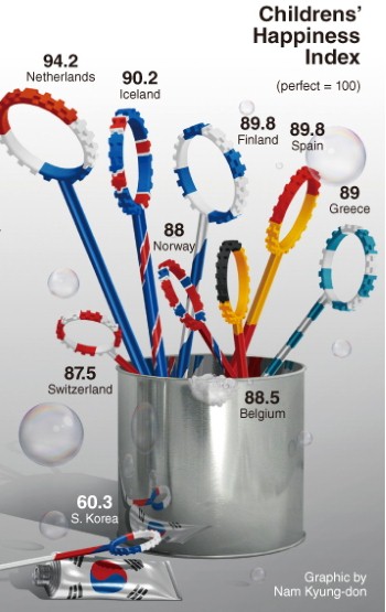 সাম্প্রতিক বছরগুলোতে ওইসিডিভুক্ত দেশসমূহের মধ্যে চতুর্থবারের মতো কোরিয়ার শিশুরা সবচেয়ে বেশী অসুখী বলে বিবেচিত হয়েছে। প্রকাশিত সর্বশেষ সমীক্ষায় কোরিয়ান স্কুলপড়ুয়া ছেলেমেয়েদের ৬০.৩ শতাংশ নিজেদের জীবন নিয়ে সুখী বলে জানিয়েছে।