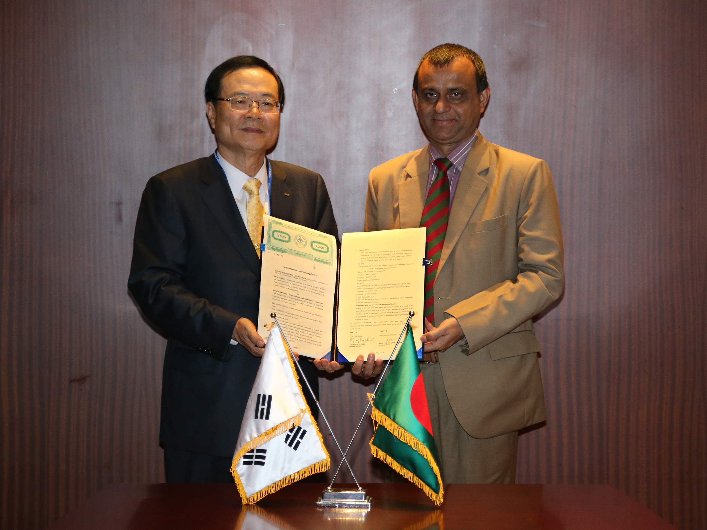 সমঝোতা স্মারকে ডিএসইর পক্ষে স্মাক্ষর করেন ব্যবস্থাপনা পরিচালক অধ্যাপক ড. স্বপন কুমার বালা এবং কোরিয়া এক্সচেঞ্জের পক্ষে স্বাক্ষর করেন চেয়ারম্যান ও প্রধান নির্বাহী কর্মকর্তা মি. কিয়ংসু চয়। এ সময় ডিএসইর পরিচালক মো. শাকিল রিজভী উপস্থিত ছিলেন।