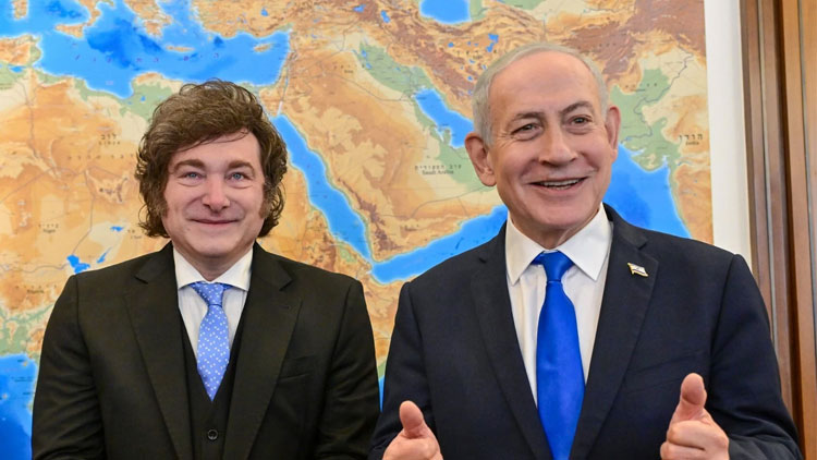 আর্জেন্টিনার প্রেসিডেন্ট হাভিয়ের মিলেইকে পাশে নিয়ে ইসরায়েলের প্রধানমন্ত্রী বেনিয়ামিন নেতানিয়াহু