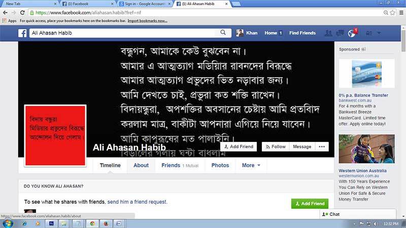 দৈনিক কালের কণ্ঠ পত্রিকার ঠাকুরগাঁওয়ের স্টাফ রিপোর্টার আলী আহসান হাবিব আত্মহত্যার চেষ্টা করেন। তিনি তারআগে ফেসবুকে তার কারণ উল্লেখ্য করে একটি হৃদয়স্পর্শী স্ট্যাটাস দেন। সেটা হুবহু বাংলাটেলিগ্রাফের পাঠকের জন্য তুলে ধরা হলো।