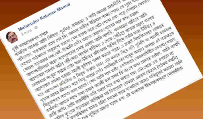 জাতীয় নাগরিক ঐক্যের আহ্বায়ক মাহমুদুর রহমান মান্না তাকে নিয়ে সৃষ্ট বিতর্ক ও অভিযোগ সম্পর্কে সামাজিক যোগাযোগ মাধ্যম ফেসবুকে একটি স্ট্যাটাস দিয়েছেন।