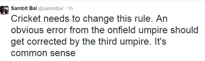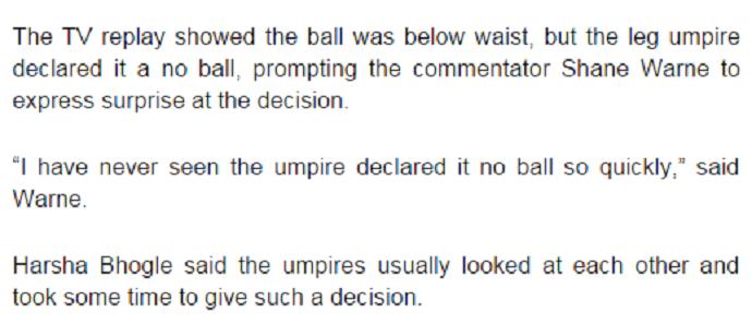 দক্ষিণ আফ্রিকার পেসার ডেইল স্টেইন টুইট করেন, ‘আমার কিছু বলার নেই। হাস্যকর সিদ্ধান্ত!’ অস্ট্রেলিয়ার প্রাক্তন লেগ স্পিনার শেন ওয়ার্ন কমেন্ট্রি বক্সে বলেন,‘এত দ্রুত ‘নো’ বলের সিদ্ধান্ত আম্পায়াররা নিতে পারে তা এই প্রথম দেখলাম। এটা নো বল ছিল না। খুবই বাজে সিদ্ধান্ত।’ হারশা ভোগলে বলেন, ‘অনফিল্ড আম্পায়াররা সচরাচর সিদ্ধান্ত নেওয়ার আগে নিজের মধ্যে আলোচনা করে। এরপর কিছু সময় নিয়ে সিদ্ধান্ত জানায়।’ ক্রিকইনফোর প্রধান সম্পাদক সামবিত বাল টুইট করে বলেন, ‘ক্রিকেটে নিয়ম পরিবর্তন করা উচিত। অনফিল্ড আম্পায়ারের একটি ভুল সিদ্ধান্ত থার্ড আম্পায়ার ঠিক করে দিতেই পারে। এটা স্বাভাবিক একটা জ্ঞান।’