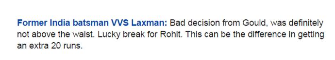 ভারতের প্রাক্তন ব্যাটসম্যান ভিভিএস লক্ষ্মণ টুইট করেন, ‘গৌল্ডের সিদ্ধান্তটা একদমই বাজে। বলটা কোনোভাবেই কোমরের ওপরে ছিল না। সৌভাগ্যক্রমে আরেকটা জীবন পেল। এখন আরও ২০ রান বেশি পাবে ভারত।’ লক্ষণের কথা সত্যি হল। জীবন পাওয়ার পর রোহিতের ব্যাট থেকে ভারত পেল ৪৭ রান। এই ৪৭ রানই কি ব্যবধান হয়ে দাঁড়ায় কিনা তাই দেখার বিষয়!