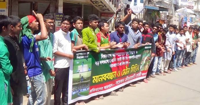 আজ দুপুরে সচেতন ক্রীড়াপ্রেমী গোষ্ঠীর ব্যানারে একদল কিশোর ও যুবক ময়মনসিংহ প্রেসক্লাবের সামনে সকাল ১১টা থেকে ১২টা পর্যন্ত মানববন্ধন কর্মসুচী পালন করে। এ সময় বক্তারা আম্পায়ারের ভুল সিদ্ধান্তের কারণে বাংলাদেশ দলের বিপর্যয়ে তীব্র নিন্দা জ্ঞাপন ও আম্পায়ারের শাস্তির দাবি করেন। মানববন্ধন শেষে তারা মিছিল সহকারে শহরের প্রধান প্রধান সড়ক প্রদক্ষিণ করে। মিছিলটি টাউন হলে গিয়ে শেষ হয়।