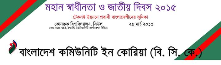 বাংলাদেশ কমিউনিটি ইন কোরিয়া (বি.সি.কে.) এর উদ্যাগে আগামী রবিবার সিউলের কনকুক ইউনিভার্সিটিতে ‘স্বাধীনতা রক্ষায় এবং টেকসই উন্নয়নে প্রবাসী বাংলাদেশী’দের ভূমিকা শীর্ষক এক আলোচনা সভা অনুষ্ঠিত হবে।