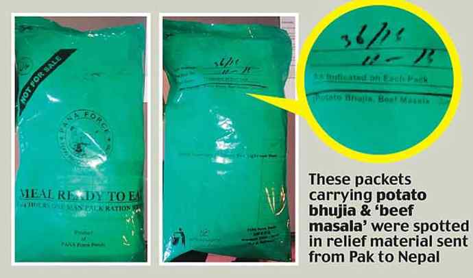 কাঠমান্ডু বীর হাসপাতালের ভারতীয় চিকিৎসকরা বুধবার ডেইলি মেইলকে জানান, নেপালের দুর্গত লোকদের ত্রাণসামগ্রীর অংশ হিসেবে মঙ্গলবার পাকিস্তান ‘বিফ মশলা’ পাঠিয়েছে। দুর্গতদের চিকিৎসার জন্য ভারত ওই চিকিৎসকদের কাঠমান্ডুতে পাঠিয়েছে।