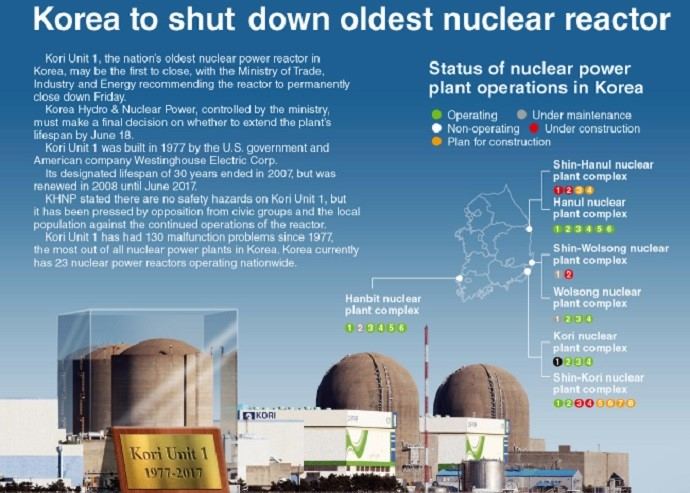 s.koreaদক্ষিণ কোরিয়া তাদের সব থেকে পুরানো পারমাণবিক চুল্লী কোরি ইউনিট- ১ বন্ধ করার সিদ্ধান্ত নিয়েছে। সম্প্রতি দেশটির শিল্প, বাণিজ্য ও এনার্জি মন্ত্রাণালয় একত্রে পারমাণবিক চুল্লীটি বন্ধ করে দেওয়ার পক্ষে সুপারিশ করেছে।