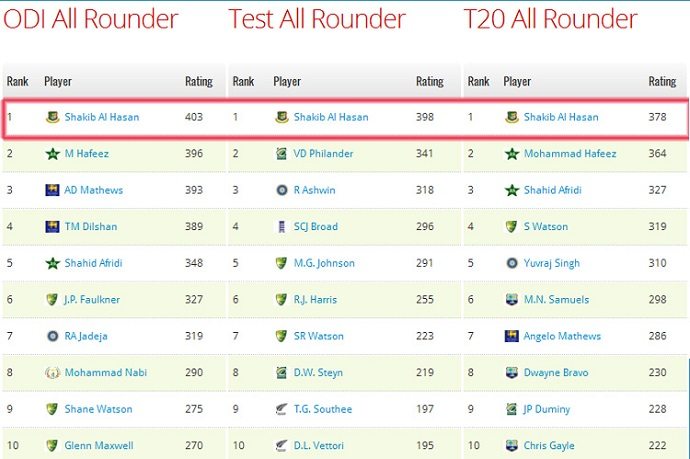 ৩৭৮ পয়েন্ট নিয়ে টি-টোয়েন্টিতেও অনেকটা একতরফাভাবে সবার উপরে সাকিব। ৩৬৪ পয়েন্ট নিয়ে পাকিস্তানের হাফিজ দ্বিতীয় স্থানে এবং তার পেছনে আছেন যথাক্রমে শহীদ আফ্রিদি (৩২৭) ও শেন ওয়াটসন (৩১৯)।