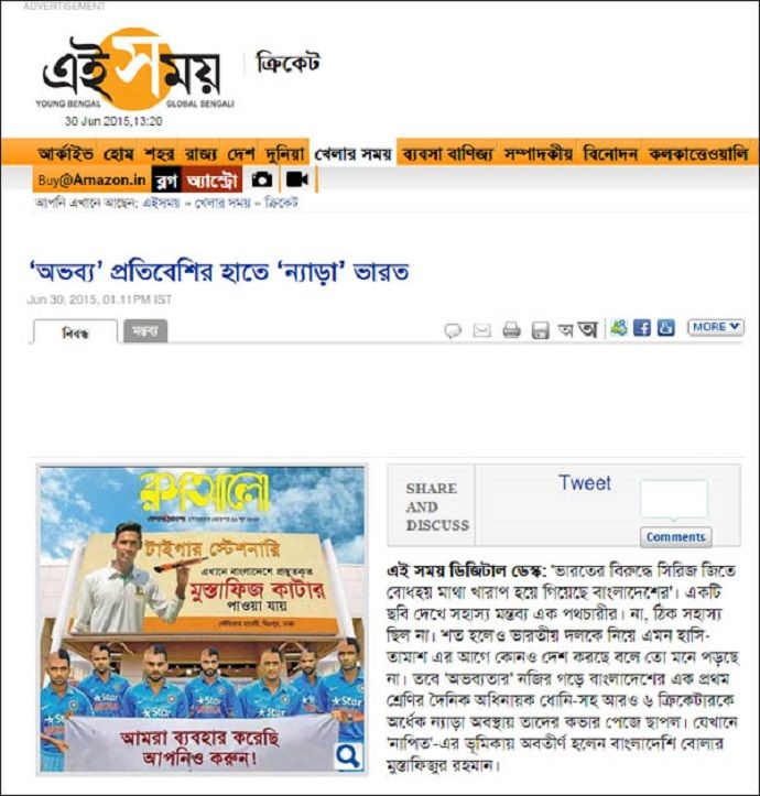 প্রথম আলো তাদের ২৯ জুনের সাপ্তাহিক ক্রোড়পত্র রস আলোতে একটি বিজ্ঞাপন ছেপেছে, যেখানে দেখা যাচ্ছে টিম ইন্ডিয়ার সমস্ত প্লেয়ার রাহানে, রোহিত শর্মা, বিরাট কোহলি, রবীন্দ্র জাদেজা, ধোনি, শিখর ধবন, রবীচন্দ্র অশ্বীনকে অর্ধেক নেড়া অবস্থায়। তার ওপরে লেখা, একটি দোকানের নাম এবং ব্যঙ্গচিত্রে ভারতীয় প্লেয়াররা বলছে আমরা মুর্তাফিজ কাটার ব্যবহার করে এমন চেহারা পেয়েছি, আপনারাও ব্যবহার করুন। এক্ষেত্রে বাংলাদেশি প্লেয়ার মুস্তাফিজুর রহমানের বিখ্যাত স্ট্রোক ‘অফকাটার’-এর কথাই বলা হয়েছে, যা ভারতীয়দের বাংলাদেশে সিরিজ হারের অন্যতম কারণ। এমনকি দোকানের ঠিকানায় লেখা রয়েছে মুর্তাফিজ কাটার পাওয়া যায় স্টেডিয়াম মার্কেট, মীরপুর, ঢাকায়।