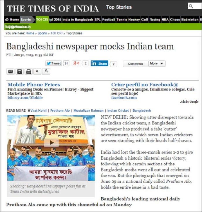 “বাংলাদেশ নিউজপেপার মকস ইন্ডিয়ান টিম” শিরোনামের রিপোর্টে টাইমস অব ইন্ডিয়া লিখেছে, “ভারতীয় ক্রিকেটারদের প্রতি চরম অবজ্ঞা দেখিয়ে একটি ভুয়া “কাটার”-এর বিজ্ঞাপনচিত্র ছেপেছে পত্রিকাটি যেখানে সাত ভারতীয় ক্রিকেটারকে দেখানে হয়েছে মাথা অর্ধেক কামানো অবস্থায়।”