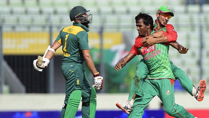 টস জিতে ব্যাট করতে নেমে নিয়মিত বিরতিতেই উইকেট হারাতে থাকে দক্ষিণ আফ্রিকা। ইনিংসের পঞ্চম ওভারে দক্ষিণ আফ্রিকা শিবিরে প্রথম আঘাত হানেন পেসার মুস্তাফিজুর রহমান। মুস্তাফিজের বাউন্সার বল ঠিকভাবে খেলতে না পেরে ব্যাকওয়ার্ড পয়েন্টে সাব্বির রহমানকে ক্যাচ দিয়ে ফেরেন কুইন্টন ডি কক। ৯ বলে ২ রান করেন এই ওপেনার।