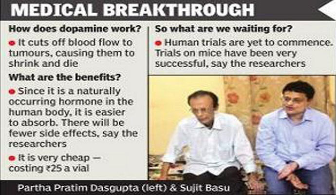 কলকাতার দুই বাঙালি চিকিৎসাবিজ্ঞানী বলেছেন, ডোপামাইন হরমোনকে কাজে লাগিয়ে সহজে ক্যানসার চিকিৎসা করা যাবে। ডোপামাইন হরমোনকে ‘হ্যাপি হরমোন’ বলা হয়। এই হরমোন টিউমার ধ্বংস করতে সক্ষম।