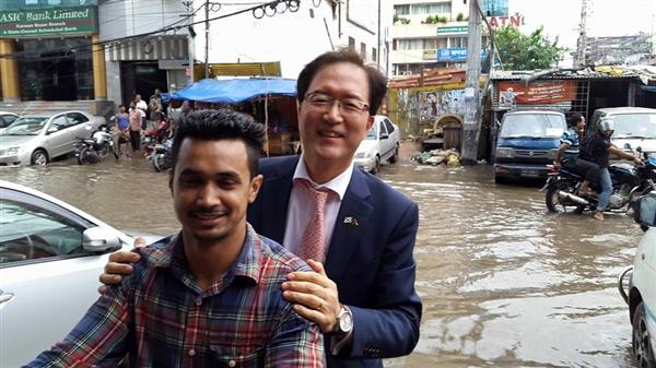 গতকাল বৃষ্টিপ্লাবিত ঢাকায় জনৈক মোটরসাইকেল আরোহীর পিছনে বসে একটি টিভি চ্যানেলের অনুষ্ঠানে অংশ নিতে যাচ্ছেন ঢাকায় নিযুক্ত কোরিয়ার বিদায়ী রাষ্ট্রদূত লী ইয়ুন ইয়ং। ছবিঃ লী ইয়ুন ইয়ংয়ের ফেইসবুক প্রোফাইল থেকে।