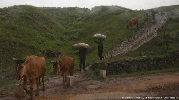রায়ানগাং রাজ্যের এই কৃষক পরিবার গরু নিয়ে কোথাও যাচ্ছেন। সাংবাদিকরা রাজধানী পিয়ংইয়ং ছেড়ে বাইরে যাওয়ার পথে ছবিটি তুলেছেন।
