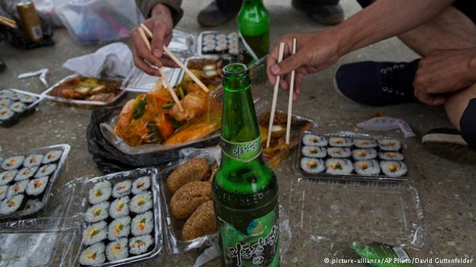 একদল উত্তর কোরীয় তাদের স্থানীয় খাবার ও স্থানীয়ভাবে উৎপাদিত বিয়ার দিয়ে পিকনিকে মেতে উঠেছেন।