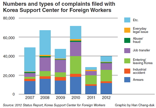 কোরিয়ায় অভিবাসন বিষয়ক যৌথ কমিটির এক জরিপে দেখা গেছে, ২০১১ সালে এখানকার বিদেশী শ্রমিকদের ৭৮ শতাংশ অসদাচরণ ও ২৭ শতাংশ যৌন হয়রানির শিকার হয়েছেন। মার্চে প্রকাশিত জরিপ প্রতিবেদনে নারী শ্রমিকদের যৌন নির্যাতনের চিত্র তুলে ধরে বলা হয় এ সময়ে অন্তত ৩৫.৫ শতাংশ নারী কর্মী ধর্ষণের শিকার হয়েছেন এবং আরও ৩৫.৫ শতাংশ মালিকদের বিরুদ্ধে অনাকাঙ্খিত শারীরিক সম্পর্কের অভিযোগ এনেছেন।