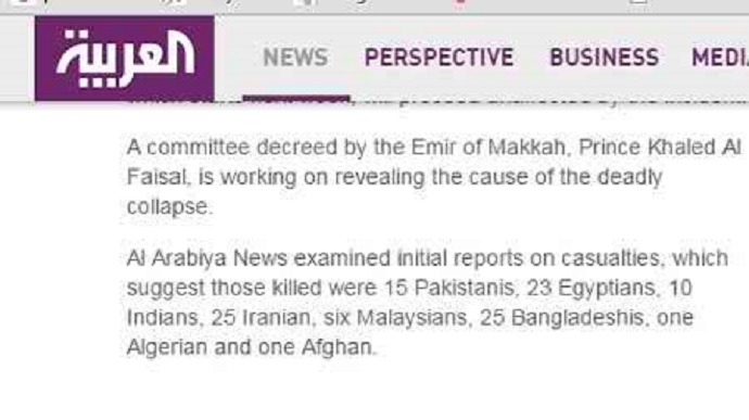 শনিবার আল-আরাবিয়া জানায়, নিহতদের মধ্যে ২৫ জন বাংলাদেশি, ১৫ জন পাকিস্তানি, ২৩ জন মিশরীয়, ১০ জন ভারতীয়, ছয়জন মালয়েশীয়, ২৫ জন ইরানের এবং একজন করে আলজেরীয় ও আফগান নাগরিক রয়েছেন।