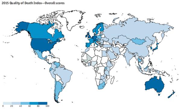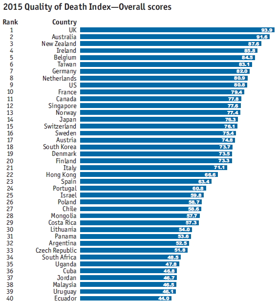 গত সোমবার প্রকাশিত ‘কোয়ালিটি অব ডেথ ইনডেক্স-২০১৫’-এ প্রকৃতপক্ষে মূল্যায়নের চেষ্টা করা হয়েছে বিভিন্ন দেশে মৃত্যুকালীন সেবার মান। ২০টি নির্ণায়কের সাহায্যে মাপা হয়েছে মৃত্যুযন্ত্রণা প্রশমন সেবার মান ও সহজলভ্যতা, লোকবল ও জীবনের শেষ দিনগুলো সহজগম্য করতে আশেপাশের মানুষজনের ভূমিকা।