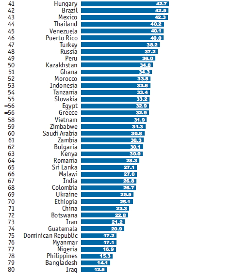 মাত্র ১৪.১ পয়েন্ট নিয়ে তালিকায় নীচ থেকে দ্বিতীয় অবস্থানে আছে বাংলাদেশ। সবার নীচে থাকা ইরাকের পয়েন্ট ১২.৫। দক্ষিণ এশিয়ার দেশগুলোর মধ্যে বাংলাদেশ ছাড়া তালিকায় স্থান পেয়েছে কেবল ভারত ও শ্রীলংকা। ২৭.১ পয়েন্ট নিয়ে শ্রীলংকার অবস্থান ৬৫তম; ২৬.৮ পয়েন্ট নিয়ে ভারত আছে ৬৭ নম্বরে।