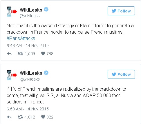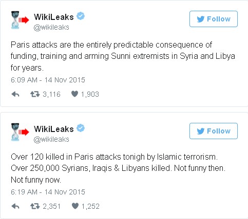 পরের দিন আরেক টুইট বার্তা ওয়েব সাইটটি বলে, প্যারিস সন্ত্রাসী হামলায় বহু মানুষ নিহত হয়েছে। ইরাক ও সিরিয়াও ২ লাখ ৫০ হাজার মানুষ নিহত হয়েছে। এই দুই মৃত্যুর সঙ্গে যুক্তরাষ্ট্র ও যুক্তরাজ্য যে উগ্রপন্থীদের প্রতিপালন করেছে তার সরাসরি যোগসূত্র রয়েছে।
