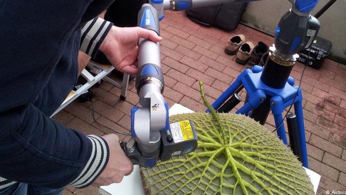 সেটাই দেখছেন তিনি: ছবিতে এক গবেষককে জলপদ্মের গঠন নিয়ে কাজ করতে দেখা যাচ্ছে৷ তিনি একটি বিমান তৈরি কোম্পানিতে কাজ করেন৷ বিমানের স্পয়লার (সাধারণত ডানায় থাকে যা বিমানকে স্থির রাখে) তৈরির নতুন উপায় খুঁজে পেতে সহায়তা করেছে জলপদ্মের এই গঠন৷