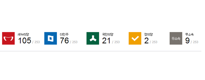 কোরিয়ার জাতীয় সংসদ নির্বাচনের ভোট গণনা শেষে শুরু হয়েছে ফলাফল ঘোষণা। রাত সাড়ে আটটা পর্যন্ত প্রাপ্ত ফলাফলে এগিয়ে আছে সরকারী দল সেনুরি পার্টি। তারা পেয়েছে ১০৫টি আসন। প্রধান বিরোধী দল ৭৬ আসন নিয়ে দ্বিতীয় অবস্থানে এবং নতুন গঠিত পিপলস পার্টি ২১ টি আসন পেয়েছে।