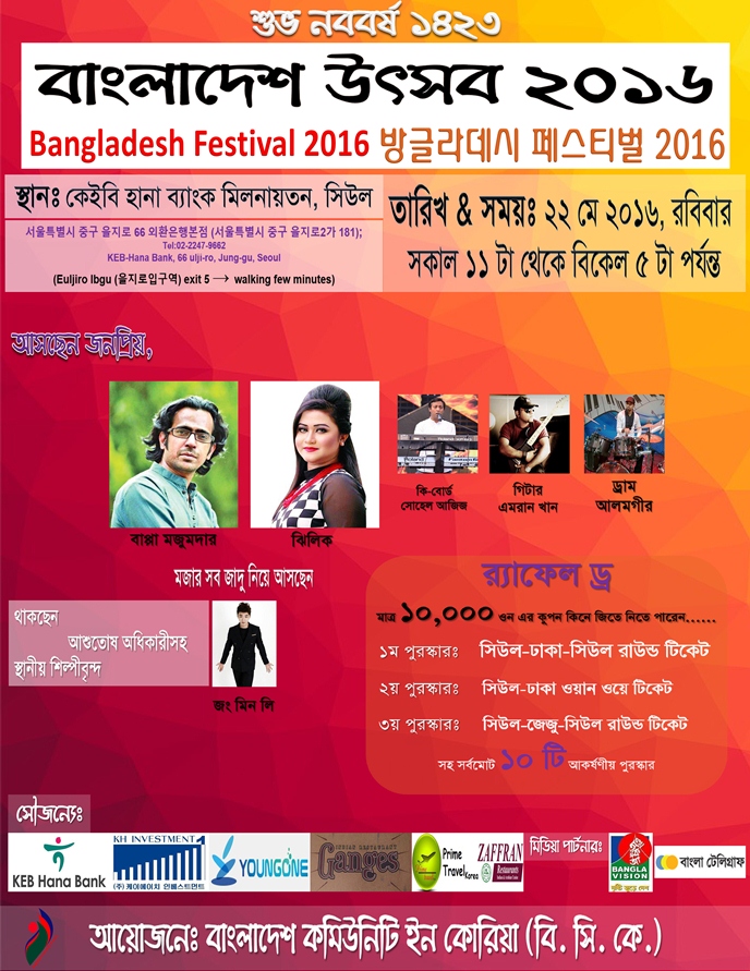 আগামীকাল সিউলে কোরিয়া প্রবাসীদের সবচেয়ে বড় উৎসব বাংলাদেশ উৎসব অনুষ্টিত হতে যাচ্ছে। সিউলের কোরিয়া একচেঞ্জ ব্যাংকের হেড অফিসের মিলনায়তনে এবারের উৎসব অনুষ্ঠিত হতে যাচ্ছে। বাংলাদেশ থেকে আসা শিল্পীদের গান, কোরিয়া প্রবাসীদের গান, নাচ, কোরিয়ান যাদুকরের যাদু, ম্যাগাজিন প্রকাশ, বাংলা খাবারের আয়োজনসহ নানা আয়োজনে মেতে উঠবে বাংলাদেশী প্রবাসীরা।