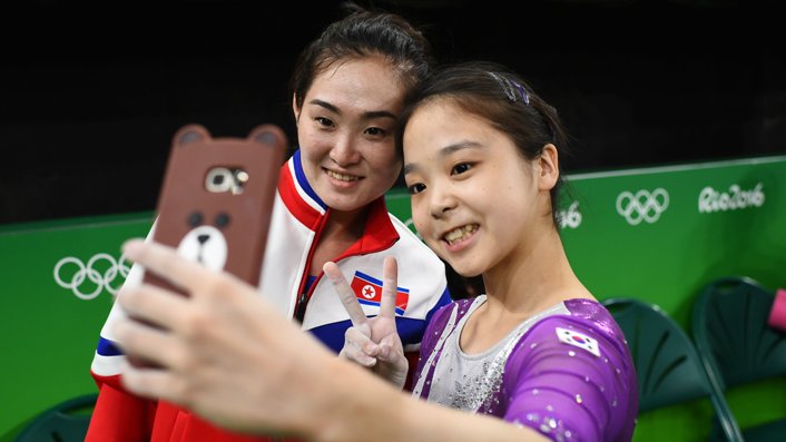 জিমন্যাস্টিকসের পাল্লায় পড়ে ক্ষণিকের জন্য হলেও এক হল উত্তর আর দক্ষিণ কোরিয়া। ২০১৬ রিও অলিম্পকের জিমন্যাস্টিকসের দুই কোরিয়ার দুই প্রতিদ্বন্দ্বী এ্যাথলেট লি ইউন জু আর হং উন জং একসঙ্গে হাসি মুখের সেলফি তুলে ক্ষণিকের জন্য হলেও দুই কোরিয়াকে জুড়ে দিয়েছে।
