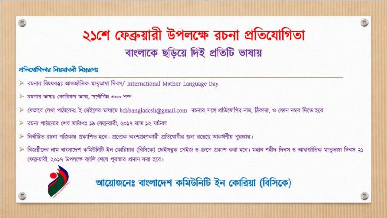 আন্তর্জাতিক মাতৃভাষা দিবস নিয়ে কোরিয়ান ভাষায় রচনা প্রতিযোগিতার আয়োজন করেছে বাংলাদেশ কমিউনিটি ইন কোরিয়া। বাংলাকে ছড়িয়ে দিই প্রতিটি ভাষায় এই শ্লোগান নিয়ে এই রচনার প্রতিযোগিতার আয়োজন করেছে।